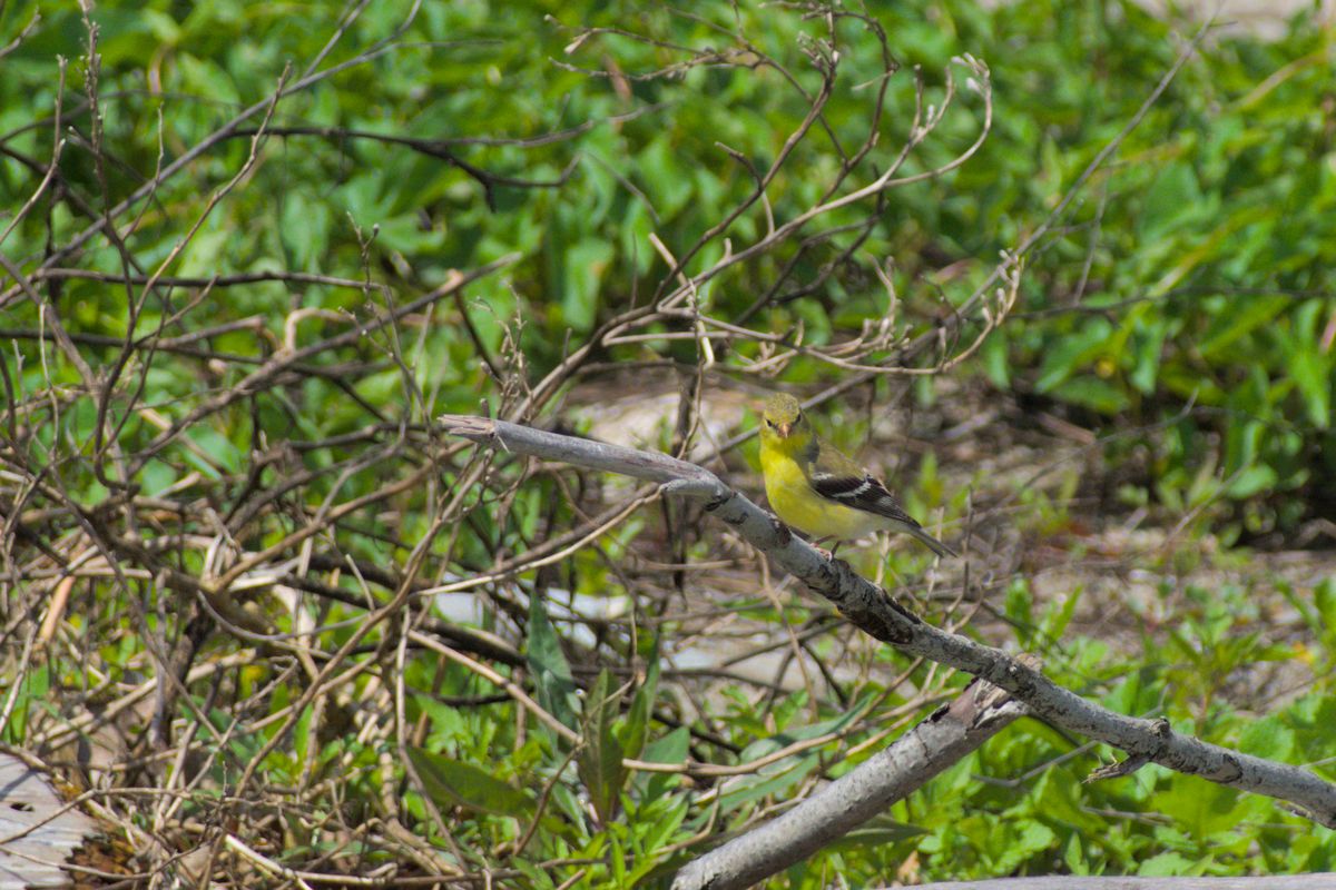 a female american goldfinch sits on tree branch looking toward the camera. she has a pale yellow body and dark gray wings with white horizontal stripes