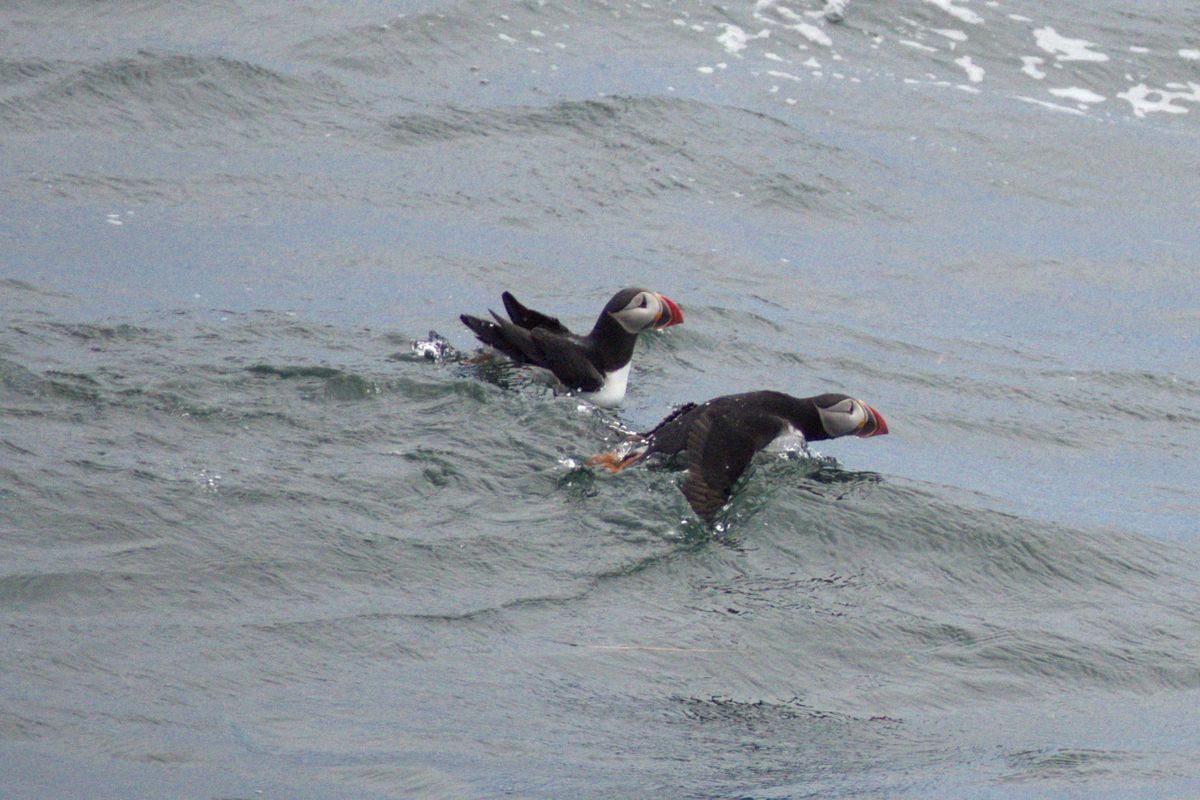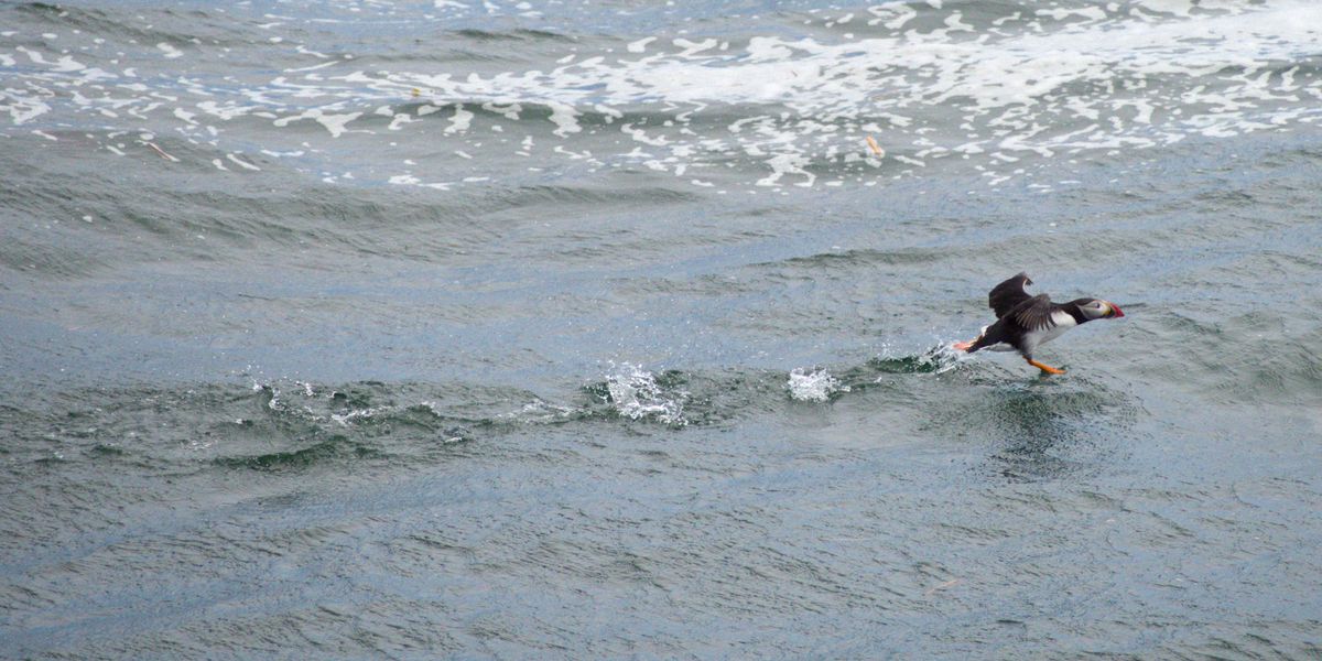 a puffin running across the water to take flight. it has left a trail of splashes in the water